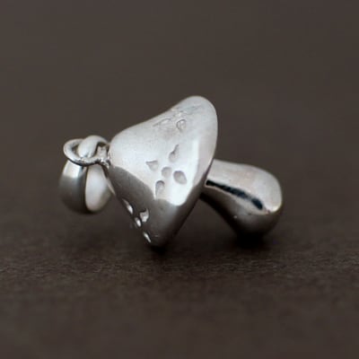 秋の定番、キノコのミニチュア。有機的なフォルム、傘部分の彫り模様がポイント。 Sv.925 14x12mm
