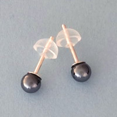 キャビアのような輝きのヘマタイトの丸珠ピアス。程よいサイズ感、ネックレスとのセットアップもおススメのスタイル。 4mmヘマタイト/ ポストSv.925