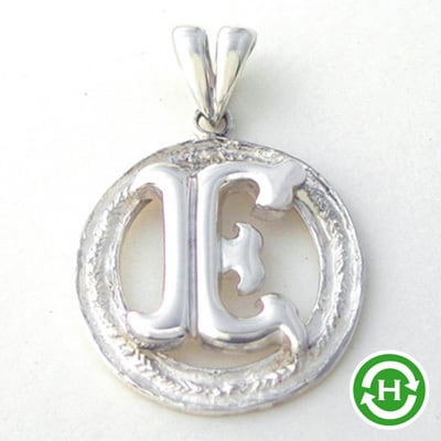残念ながら生産中止になった、貴重なイニシャルのペンダントトップ。テクスチャーのあるリースのセンターに、鏡面仕上げの「E」。新品同様のグッドコンディション。