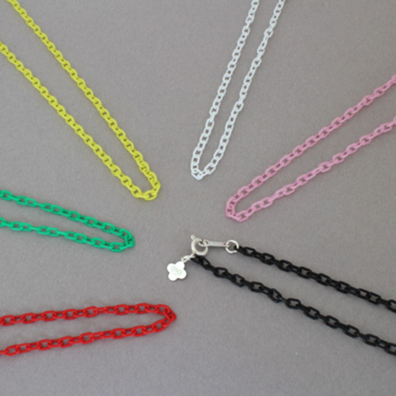 色遊びが楽しめるカラフルなチェーン。被れるのが嬉しいロングサイズ。金具部分にH&H刻印入りフラワーのポイント。