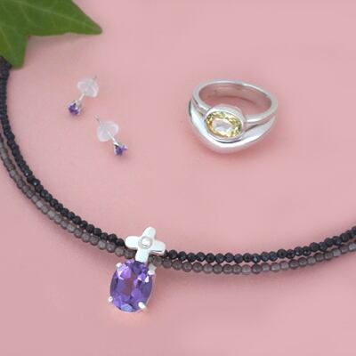 色鮮やかなパープル、オーバルカットのアメシスト。フラワーの通しがインパクトのあるポイントに。