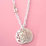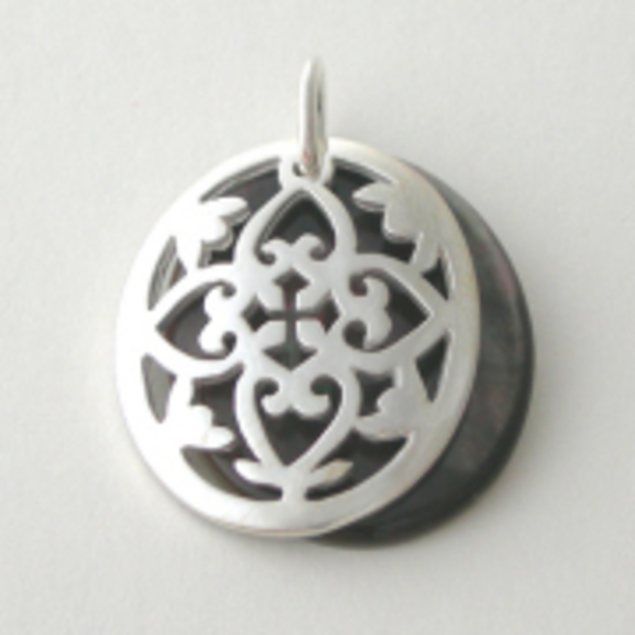 クロスを囲む、4つのハートのヌキ模様。 シルバーと蝶貝のコントラストが楽しい、華やかなトップです。 SV. X 蝶貝 32X28mm
