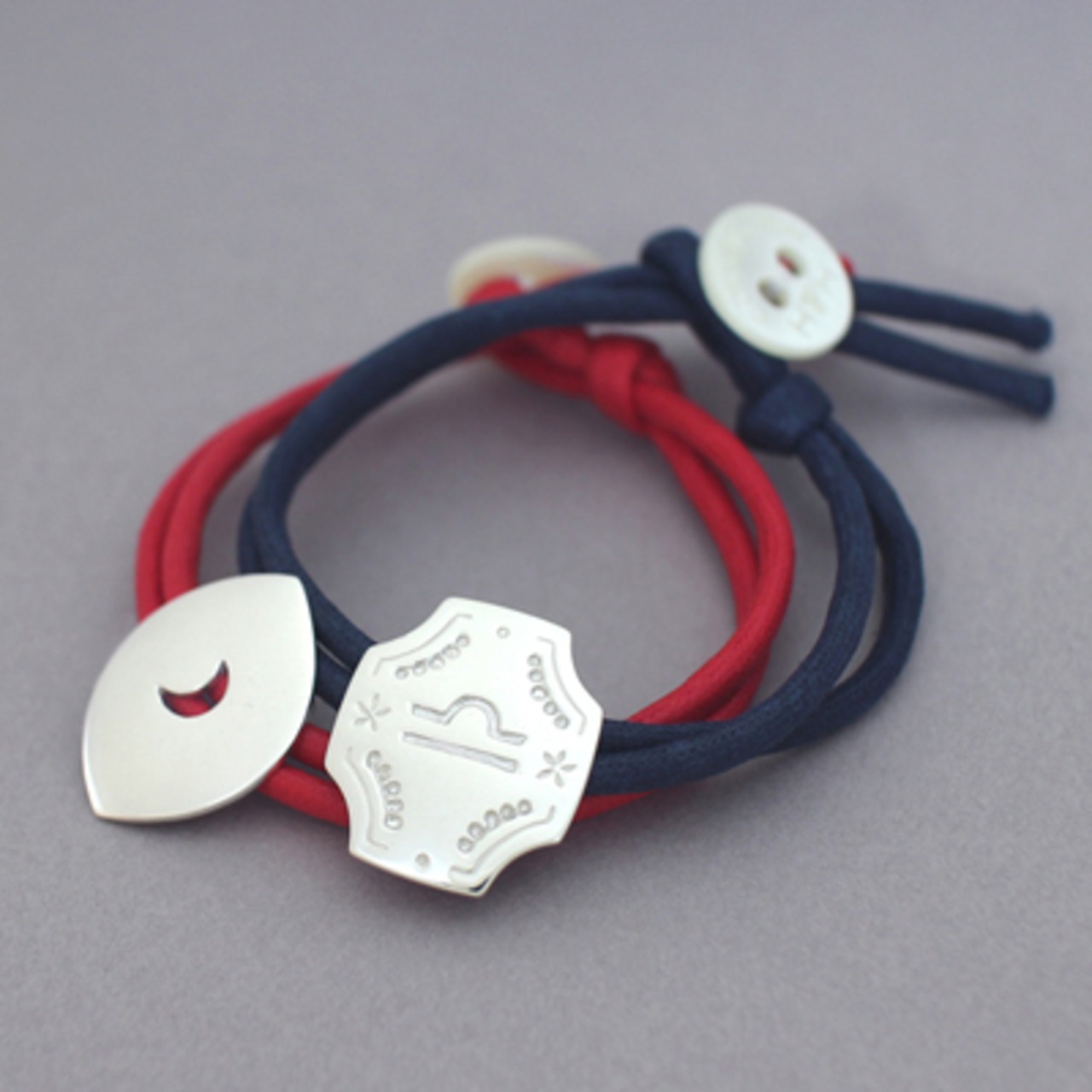 月のシルバーパーツがポイントのロープブレス。結び目のホールに、ボタンで留める仕様。裏面は、付属のプラスチックパーツでロープを固定。お好みの色にロープを替えてお楽しみいただけます◎付け替え用ロープは、Waxロープブレス(2本set)をお選びください。